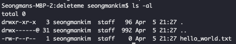 -rw-r--r-- 3 seongmankim staff 0 Apr 5 21:27 hello_world.txt