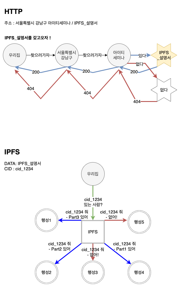 보통 IPFS 는 HTTP 프로토콜과 많이 비교를 한다. 이 둘의 차이는 파일을 불러오는 방식에 큰 차이가 있다.